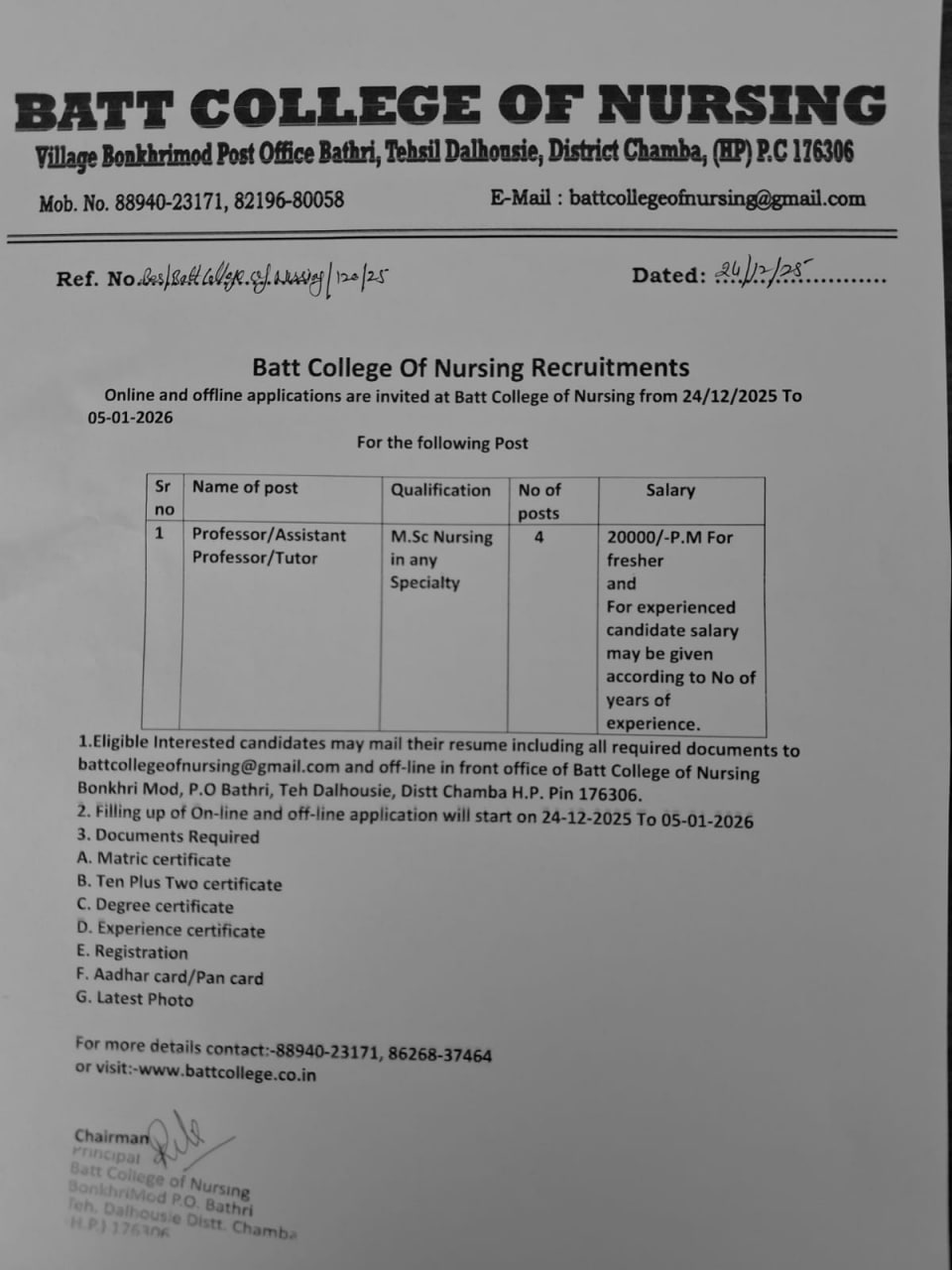 Recruitment of Professor / Assistant Professor / Tutor – Batt College of Nursing